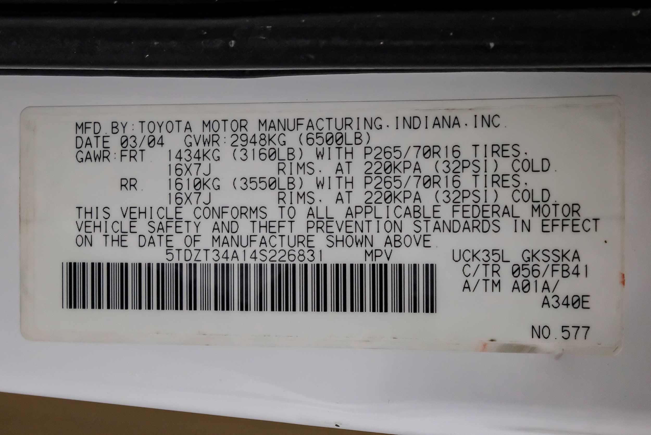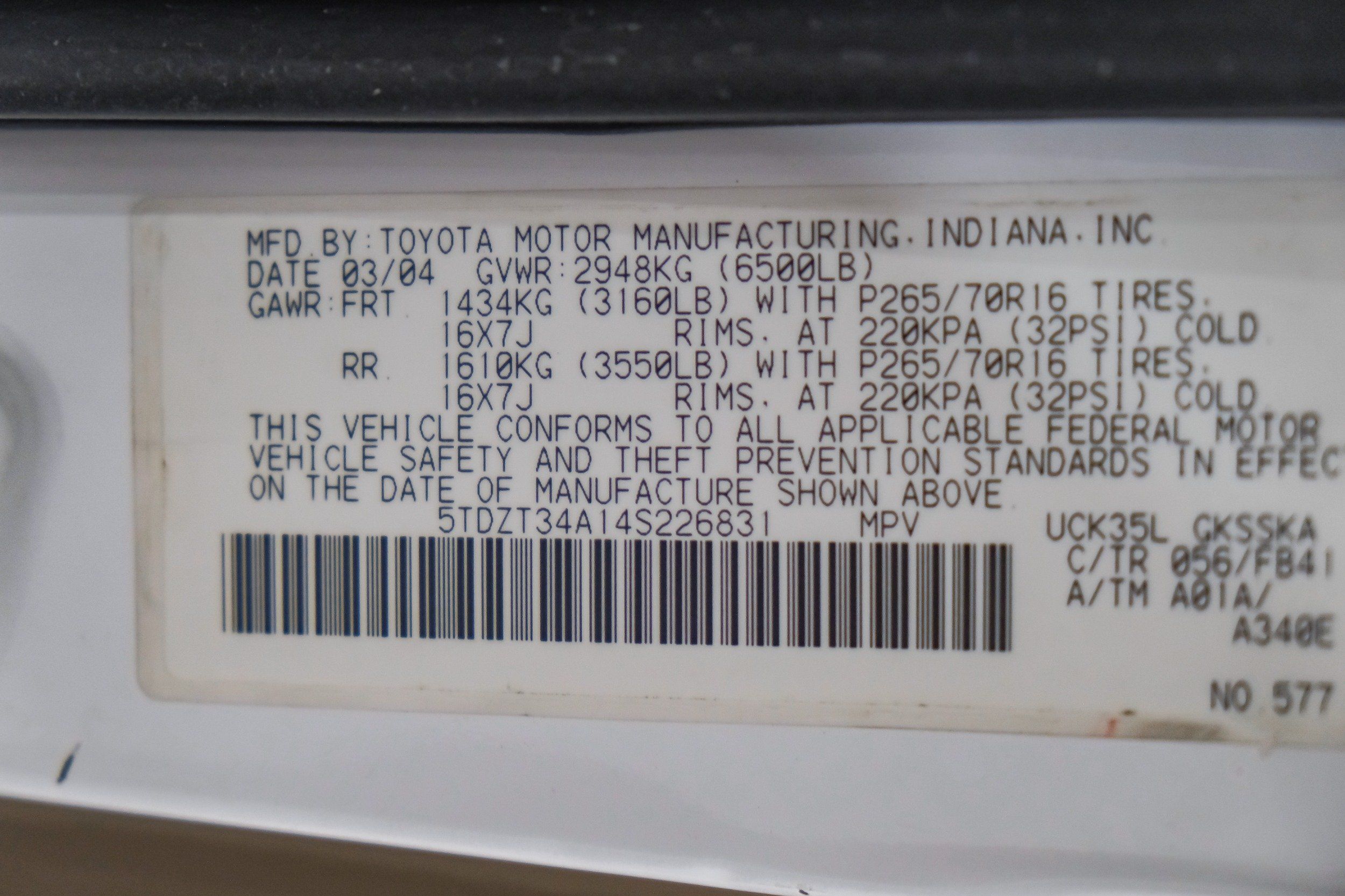 | VIN | 5TDZT34A14S226831 |