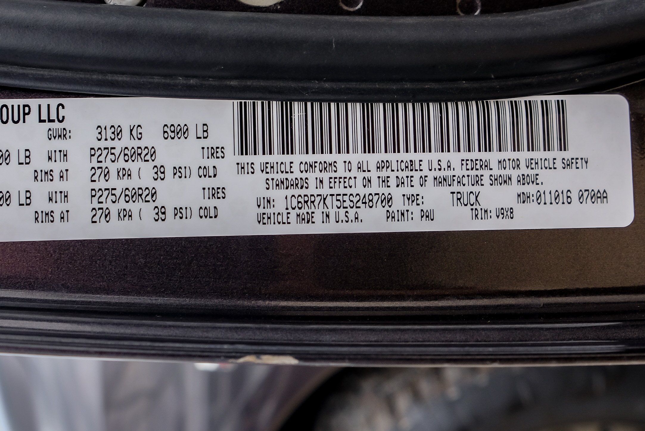 | VIN | 1C6RR7KT5ES248700 |