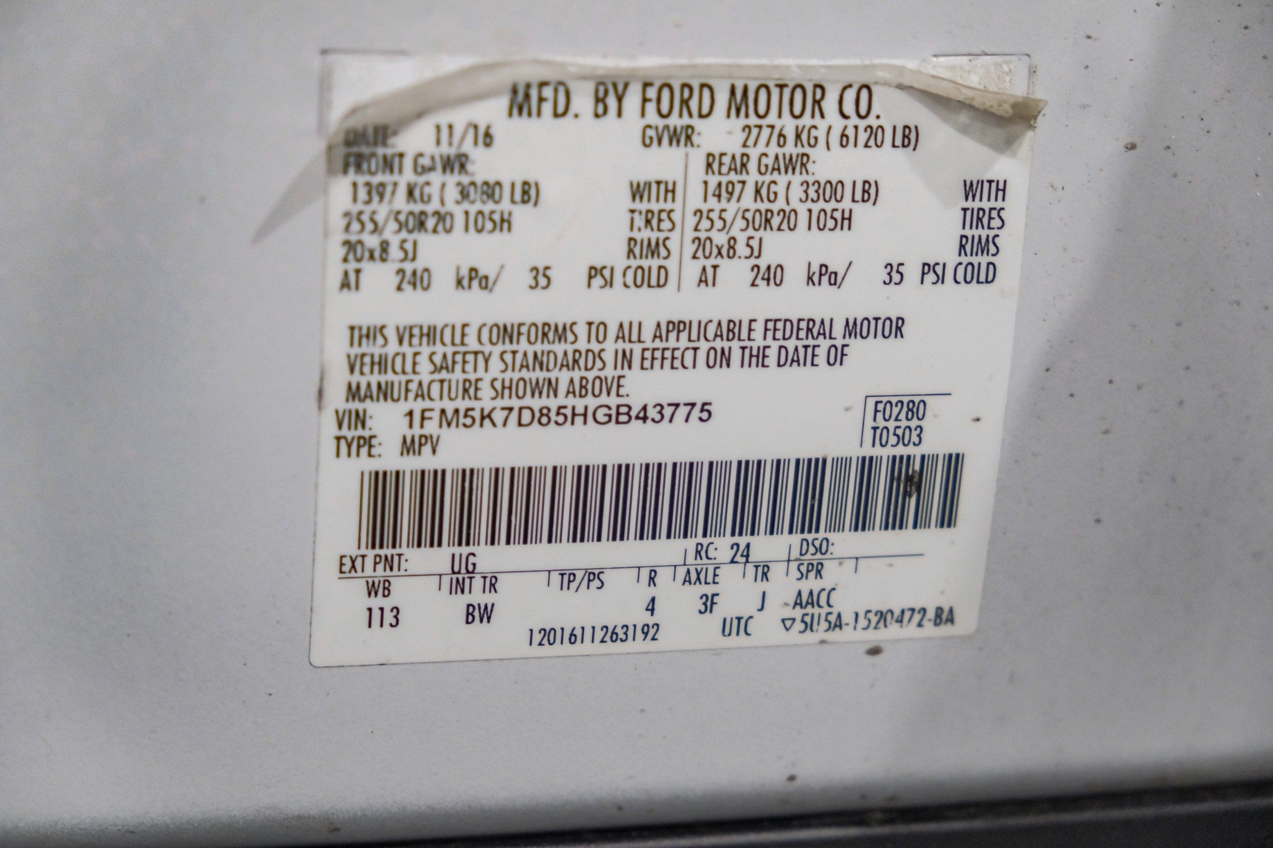 | VIN | 1FM5K7D85HGB43775 |