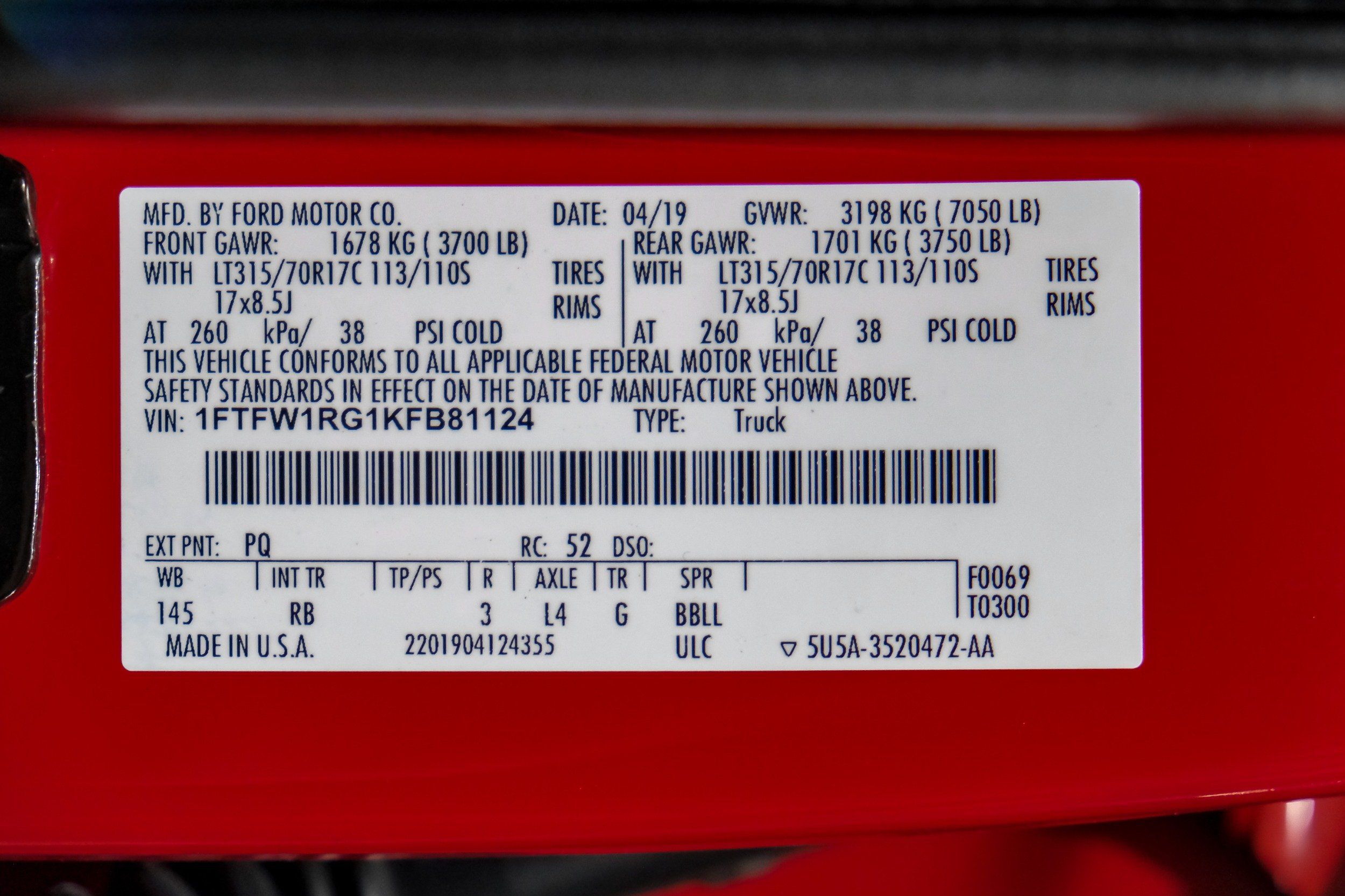 | VIN | 1FTFW1RG1KFB81124 |