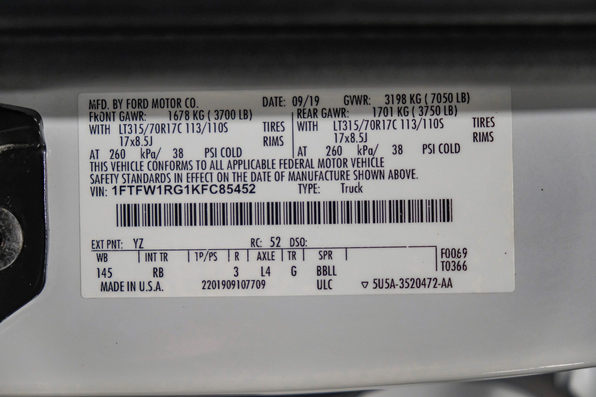 | VIN | 1FTFW1RG1KFC85452 |