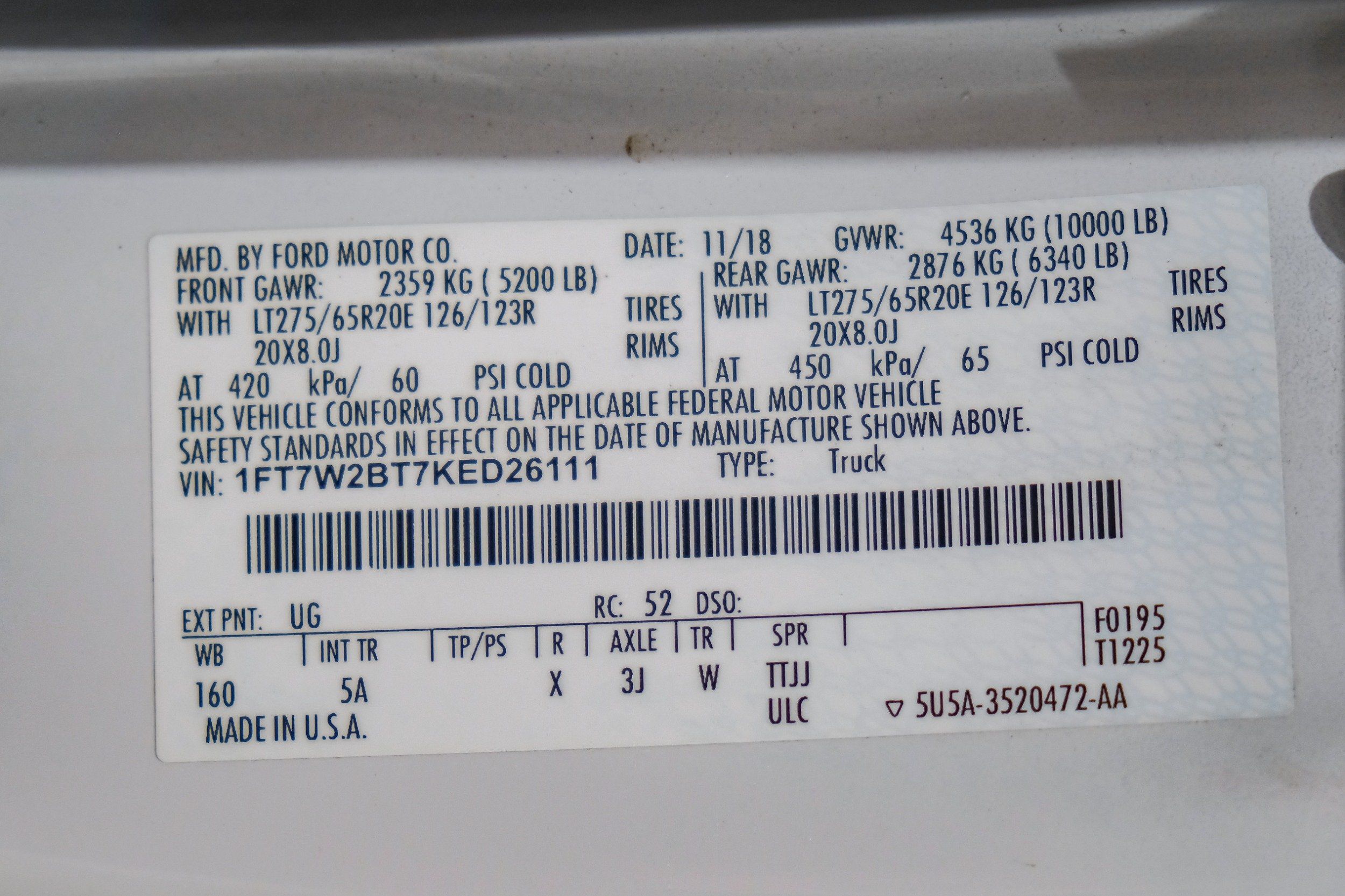 | VIN | 1FT7W2BT7KED26111 |