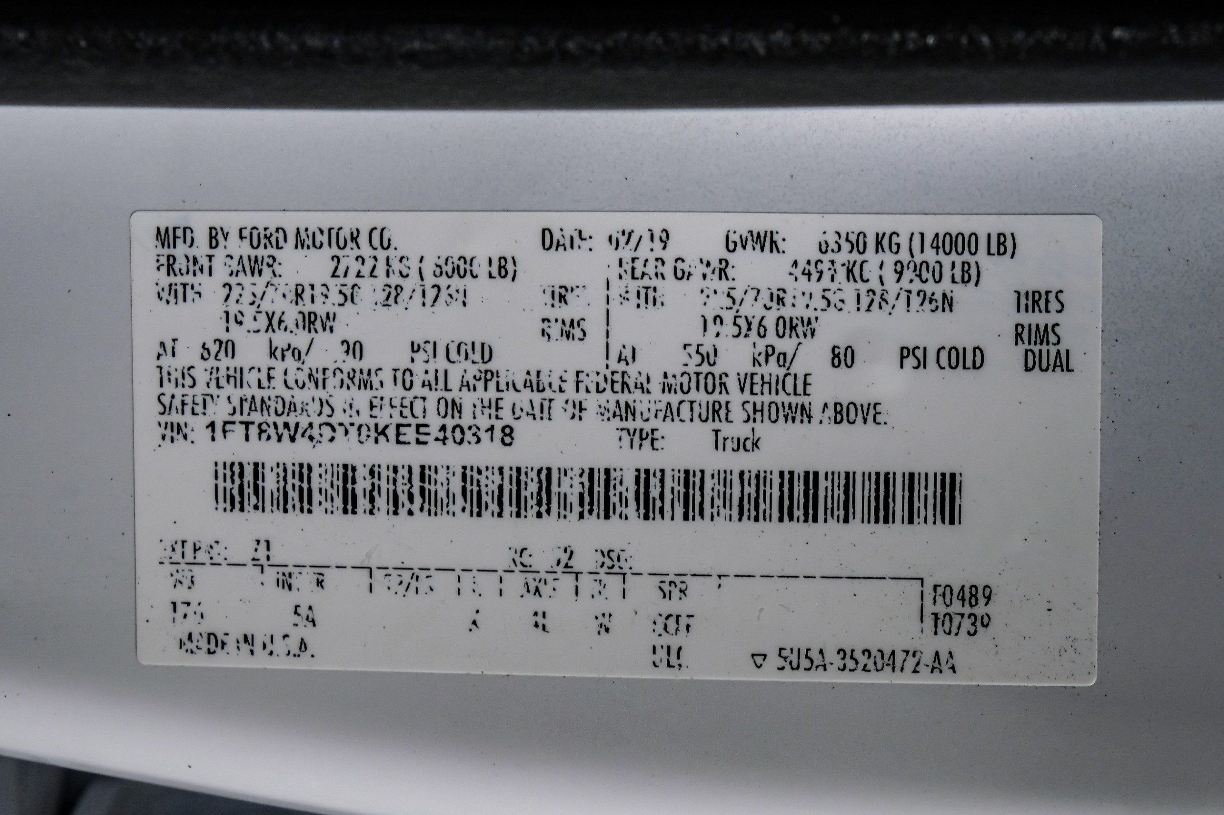 | VIN | 1FT8W4DT0KEE40318 |