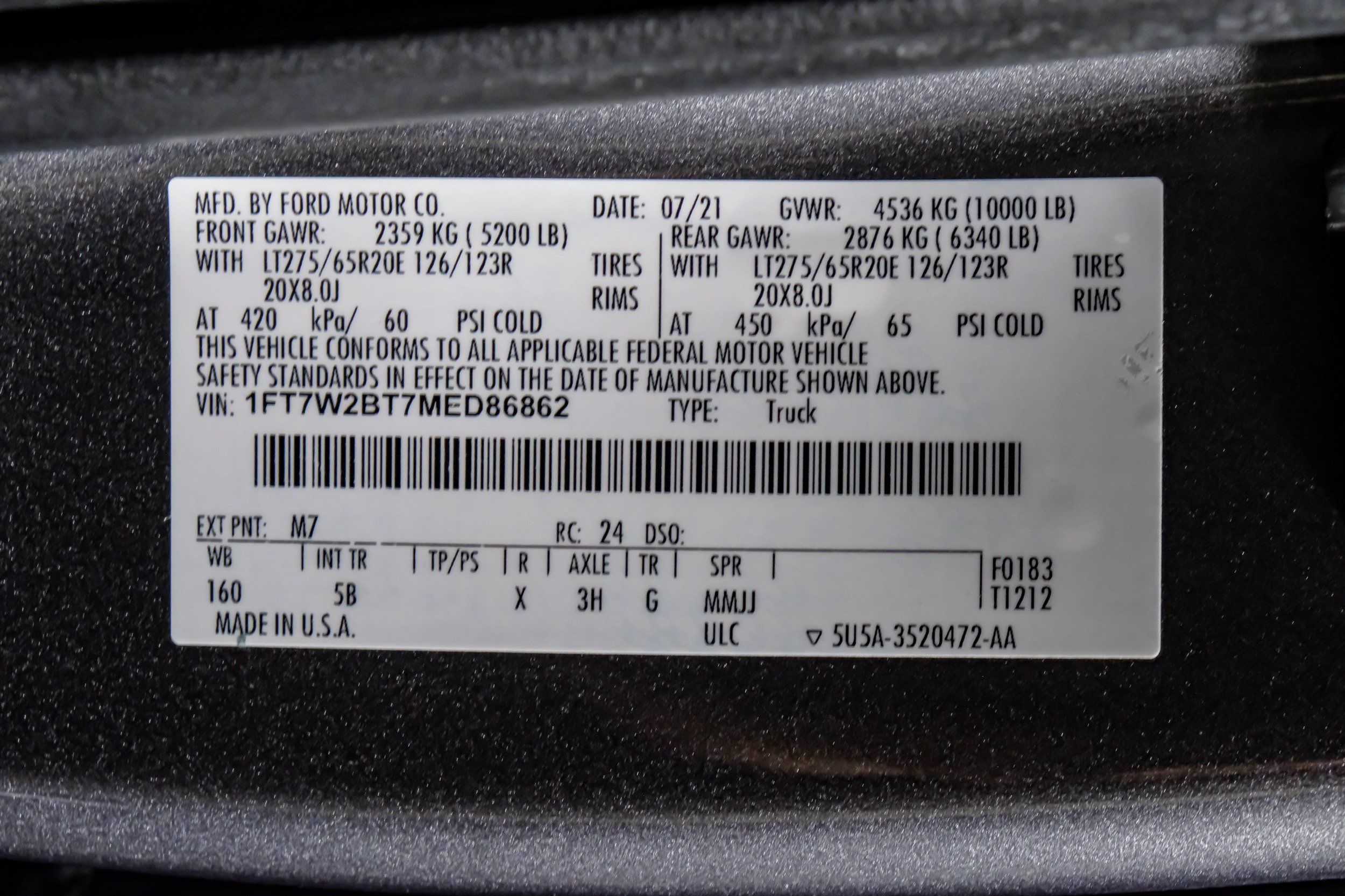 | VIN | 1FT7W2BT7MED86862 |