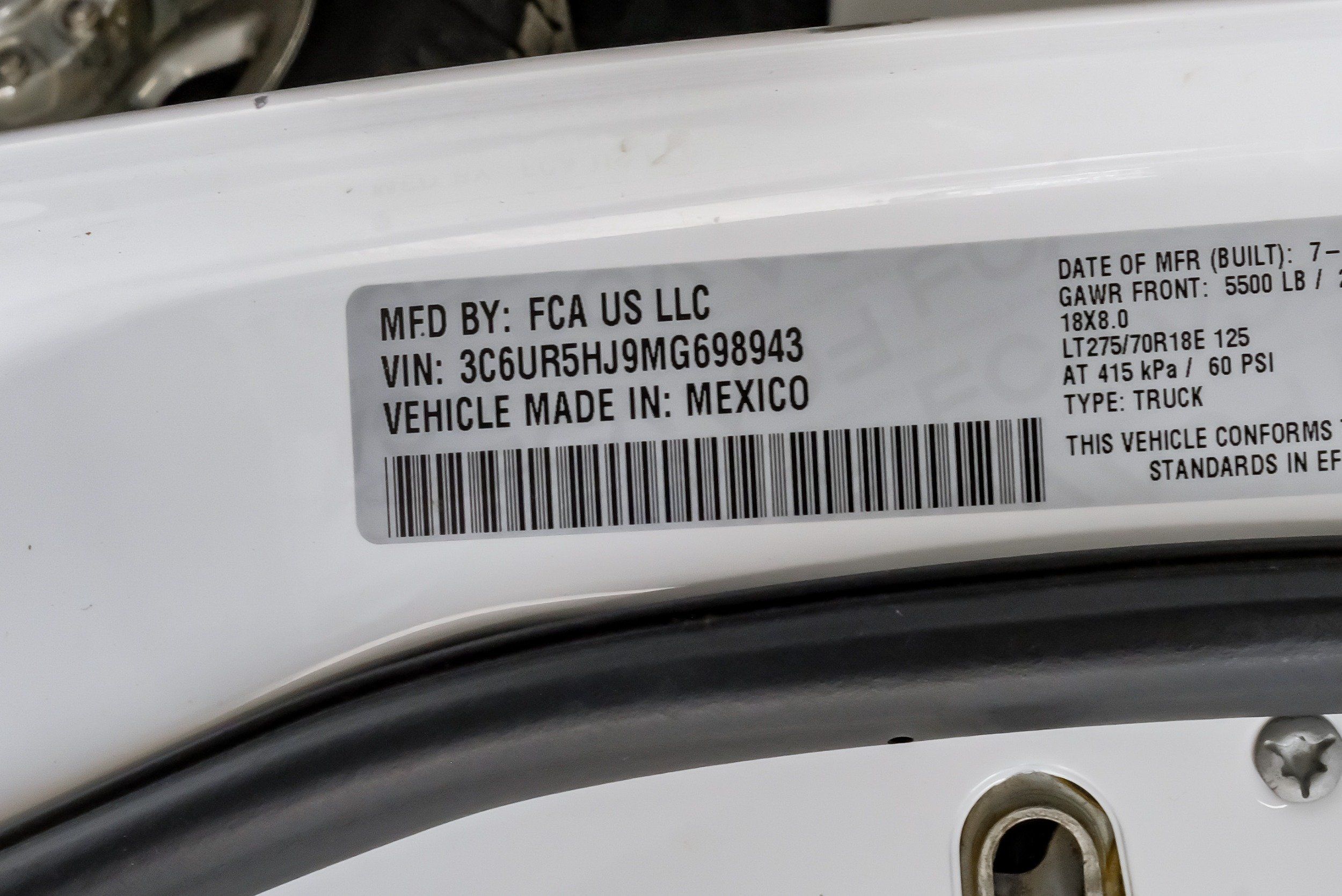 | VIN | 3C6UR5HJ9MG698943 |