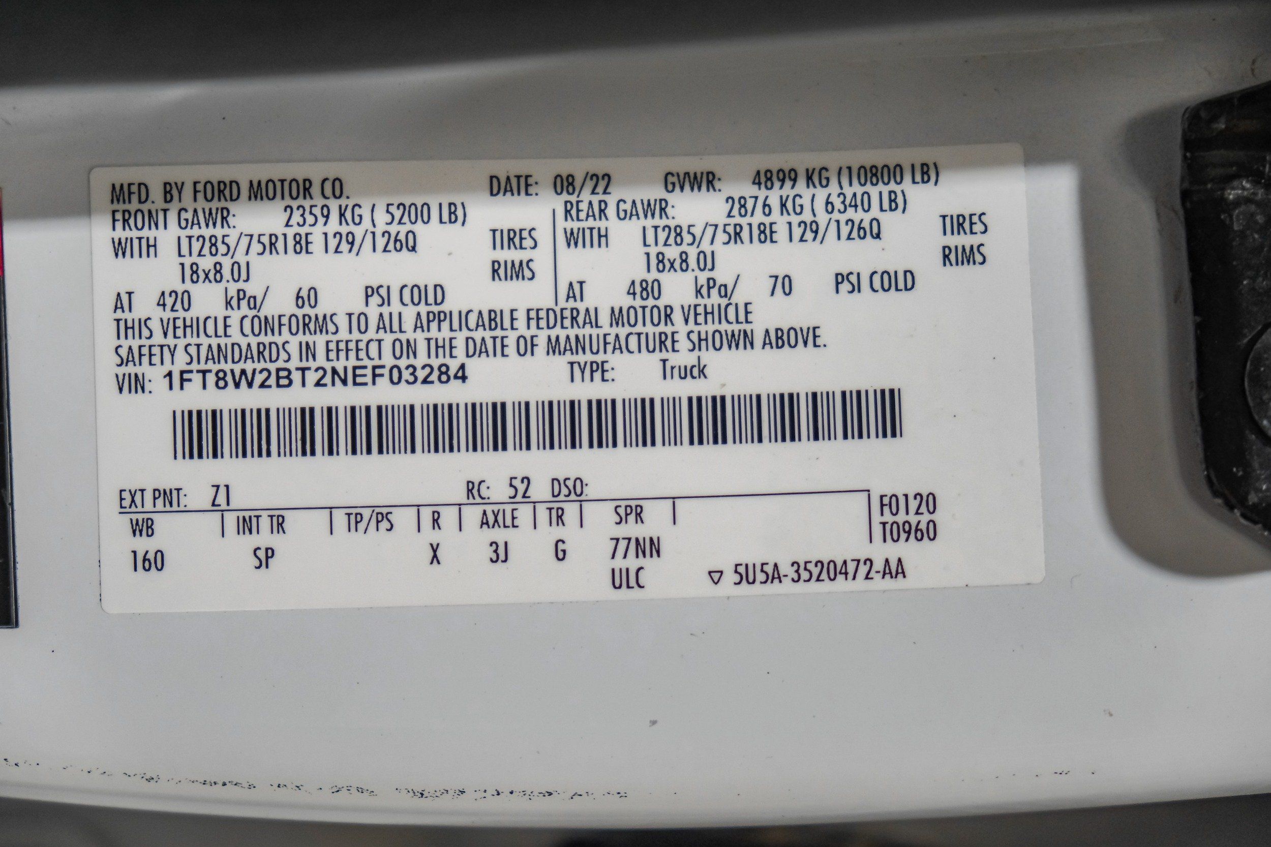 | VIN | 1FT8W2BT2NEF03284 |