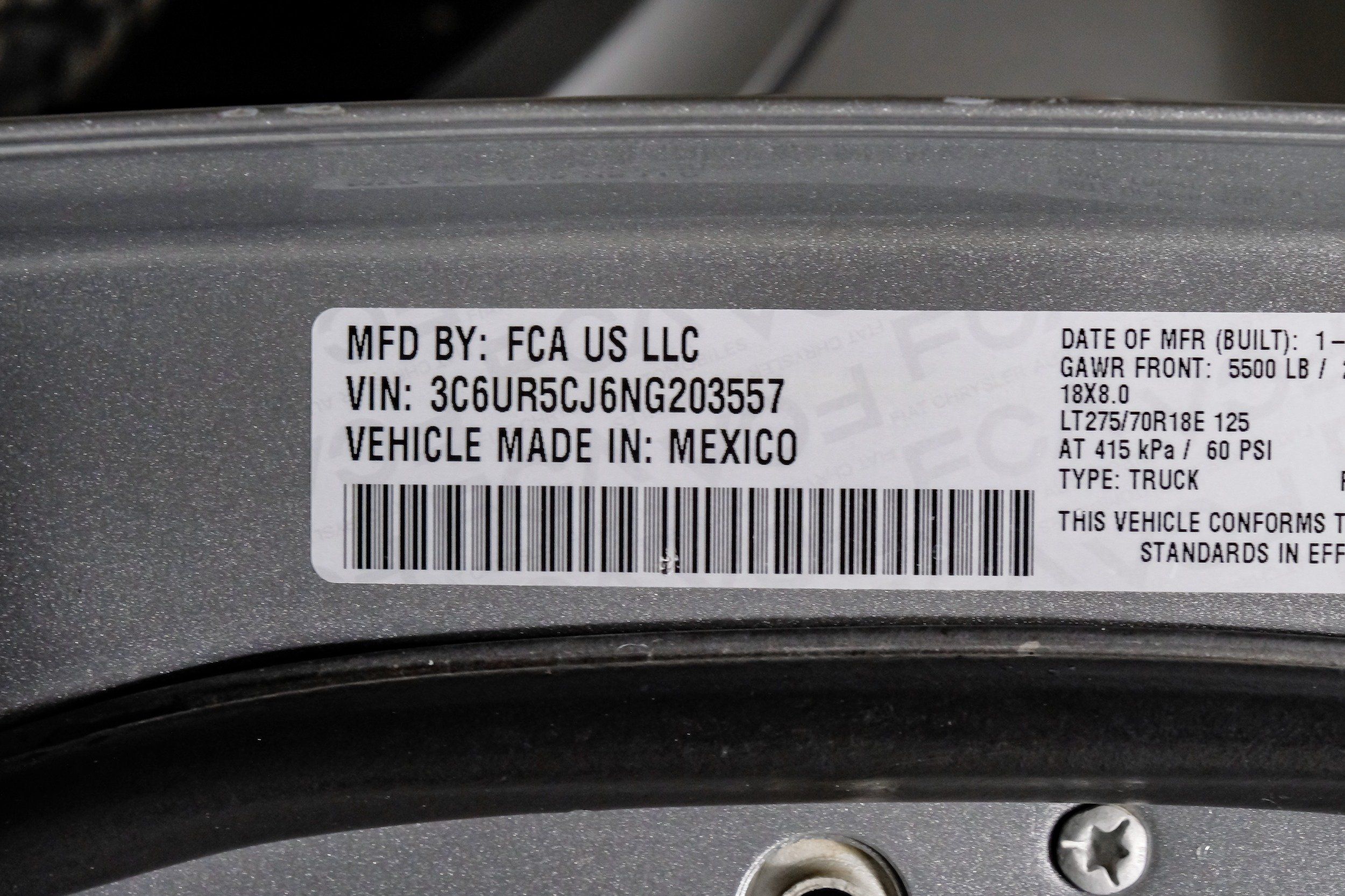 | VIN | 3C6UR5CJ6NG203557 |