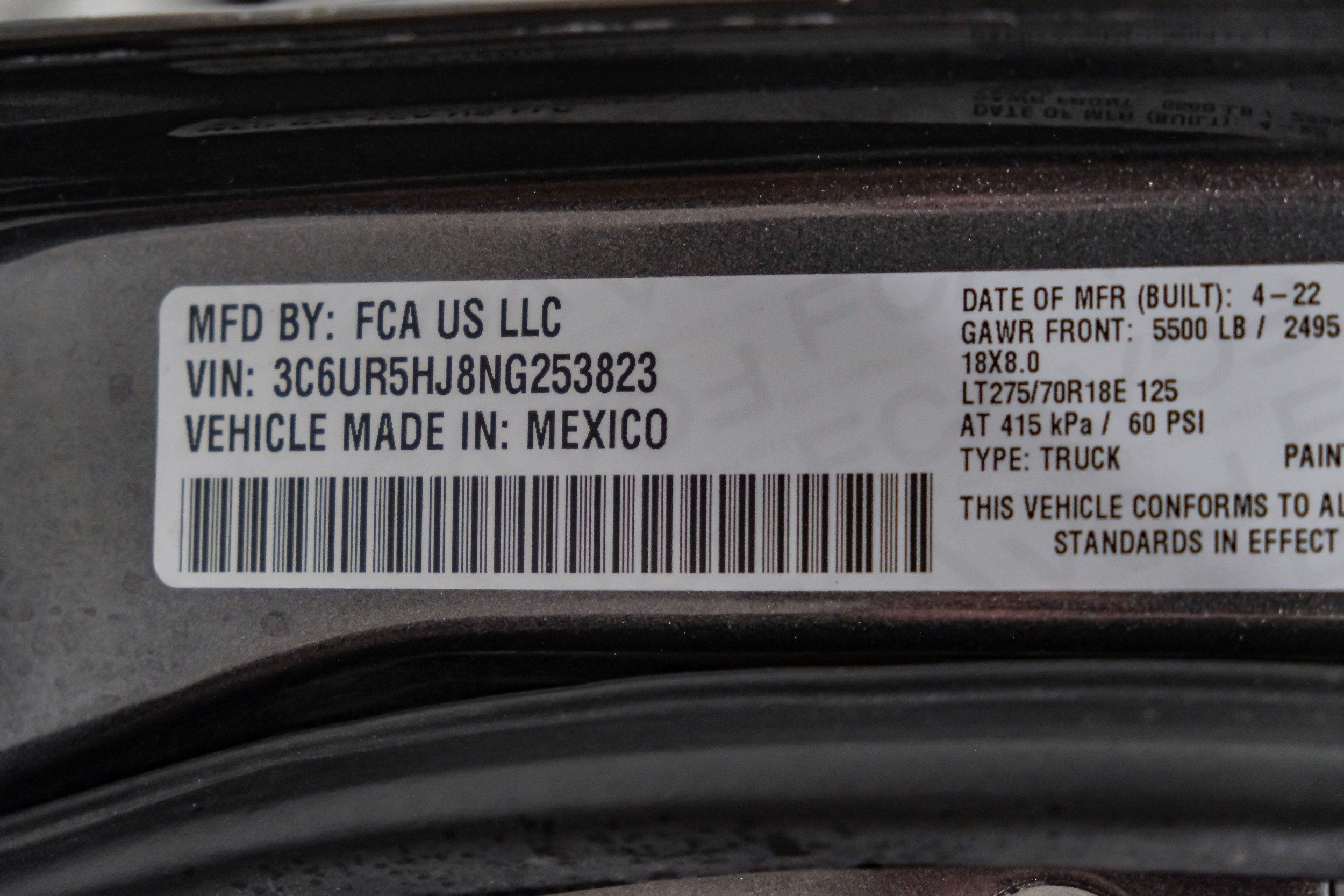 | VIN | 3C6UR5HJ8NG253823 |
