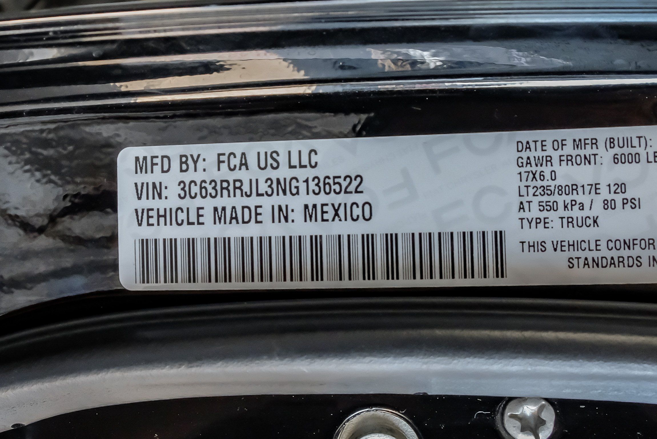 | VIN | 3C63RRJL3NG136522 |