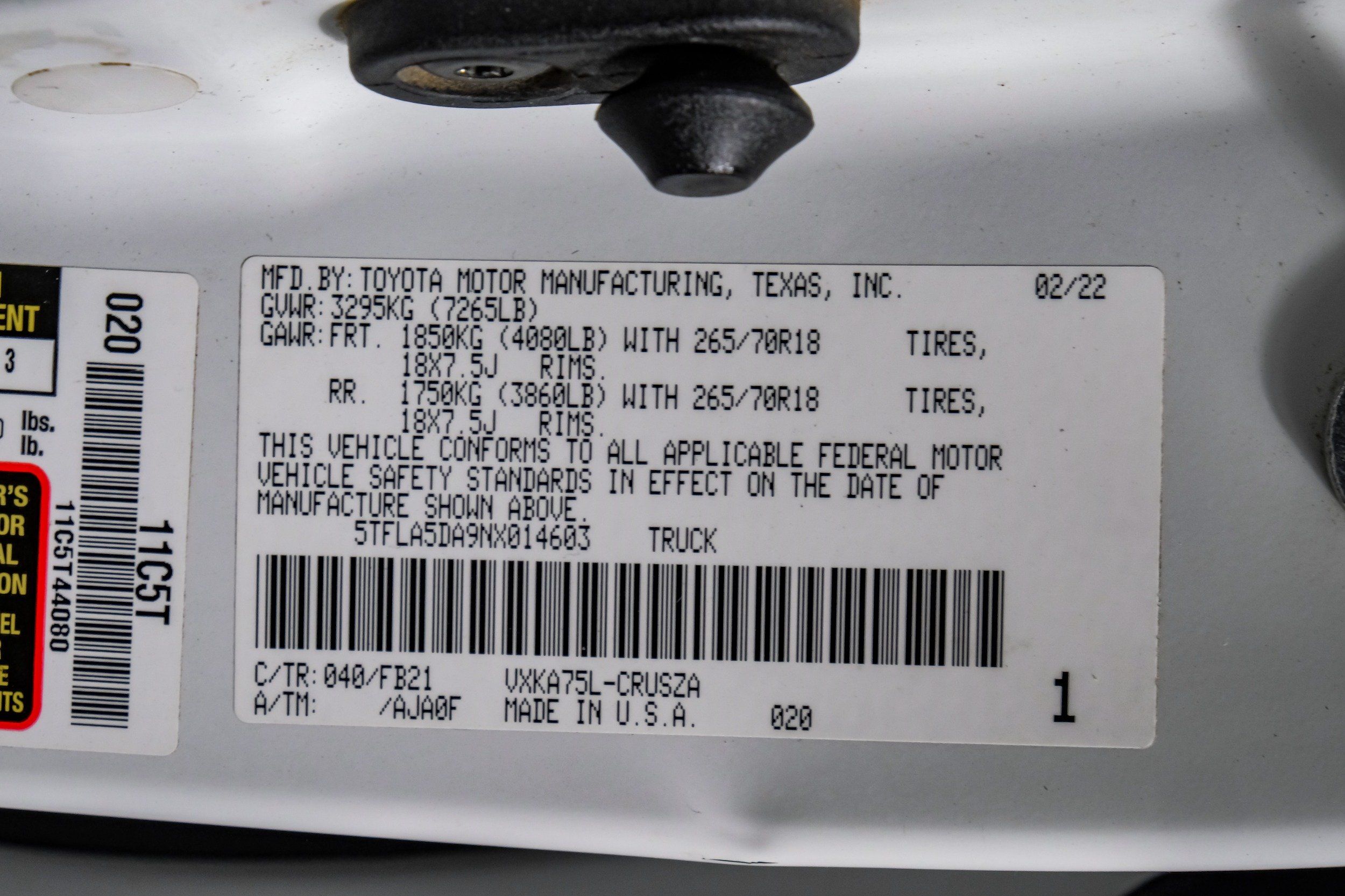 | VIN | 5TFLA5DA9NX014603 |